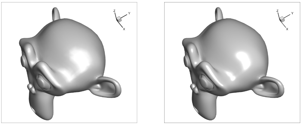 “平滑”与“带折痕平滑”选项采用新的冯氏光照模型,较之前的高洛德着色法有所提升,如下图所示(左侧为高洛德效果,右侧为冯氏/平滑效果)。